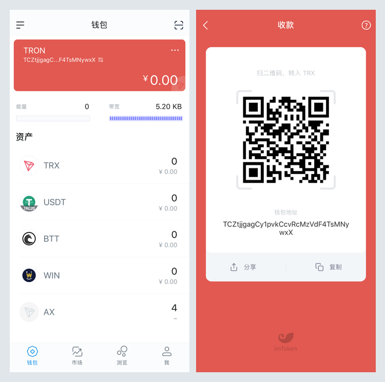 用imToken发起转账、收款都很便捷,支持扫码,也支持复制地址。